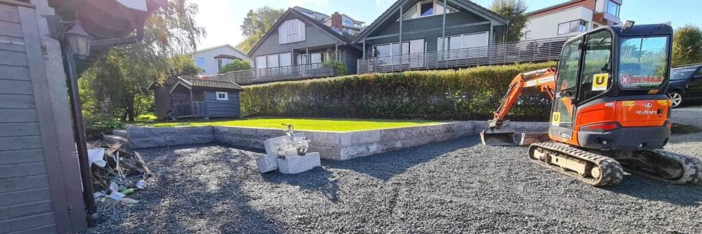 Vi kan hjelpe deg med støttemurer av naturstein, betongstein eller andre materialer, samt kantstein, belegningsstein, brostein, beplantning, jord bark og ferdigplen.